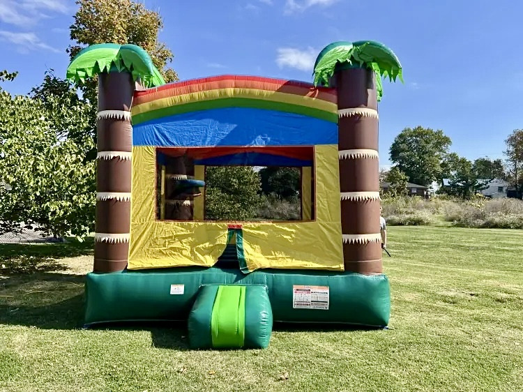 Bring a slice of the tropics to your next party with this Safari (14x14) Bounce House — a roomy, colorful inflatable perfect for kids’ birthdays, neighborhood gatherings, school events, or church picnics. Measuring 14 by 14 feet, it offers a generous jumping surface with high mesh windows on all sides for excellent airflow and easy adult supervision. Four palm-tree corner pillars and a rainbow-accented roof give it a fun, jungle-themed look that instantly sets a playful mood. The low step entry makes access simple for little ones, while the durable vinyl construction and reinforced seams stand up to active use. Optional add-ons like a mini basketball hoop and gymnastic mat increase play options; a 4500 W generator and on-site event staff are available if you need power or extra supervision. Clean, bright, and family-friendly, this bounce house is designed to keep children bouncing safely and happily for hours.
