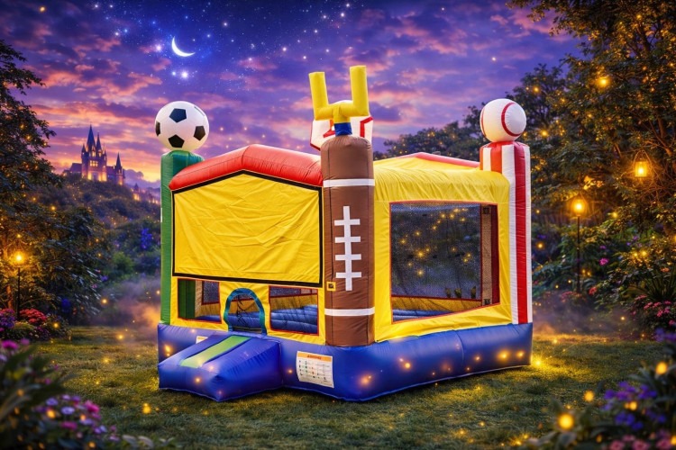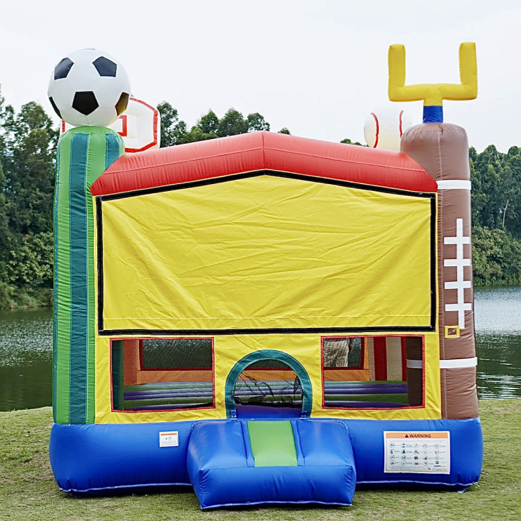 Bright, bold, and ready to play — this Sports 13x13 Bounce House turns any backyard or event space into a mini stadium. Sized to comfortably fit a group of kids, it features a roomy 13x13 bouncing area, mesh side windows for airflow and adult visibility, and a low step entrance for easy access. The colorful inflatable corner posts are topped with giant sports icons — a soccer ball, baseball, basketball hoop and a football goal post — giving it an energetic, all-sports theme that matches birthday parties, team celebrations, and community events. Built for rental use, it pairs well with an on-site generator and optional add-ons like a gymnastic mat or mini basketball for extra games, and trained event staff can be provided to supervise. Durable, fun, and instantly eye-catching, this bounce house brings safe, active entertainment to kids who love anything sports-related.