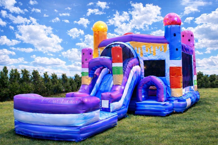 Cool, colorful, and built for nonstop fun, the Ice Pops Bounce House Combo is a vibrant inflatable play system that combines a roomy bounce area, an attached slide, and a splash-ready landing for a single all-in-one attraction. Its candy-bright pillars and purple-and-blue palette make it an instant party centerpiece kids will flock to. Inside the main bounce chamber there are high mesh windows for easy supervision and airflow, plus a soft entry/exit tunnel that keeps traffic flowing safely. The climb-and-slide section delivers a gentle yet thrilling drop into the cushioned catch pool—choose wet or dry depending on the day’s weather and your event needs. Durable vinyl construction and reinforced seams stand up to active play, and optional add-ons like a 150 ft water hose, slide slick, or generator make setup simple for outdoor locations. Perfect for birthday parties, neighborhood gatherings, or summer events where young guests want bouncing, climbing, and sliding all in one bright, safe rental.
