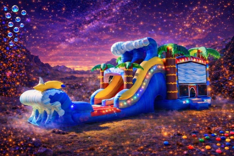 Dive into a splash of fun with this ocean-themed combo: a roomy bounce area framed like a shark’s mouth, a tall double slide with a gentle curve, and a water-ready splash pool at the base (can be set up wet or dry). Bright blues, palm-tree accents, and wave details make it a crowd-pleasing centerpiece for backyard parties, school events, or community gatherings. The bounce space has mesh sides for airflow and visibility so adults can keep an eye on kids, and a low entrance for easy access. Durable vinyl construction and clear safety labeling make it a reliable choice for high-energy play. Add-ons available include a 4500 W generator, long water hose, slide slick lubricant, gymnastic mat, mini basketball, or on-site event staff to help run the attraction. Ideal for ages 3–12 (adult supervision recommended); perfect when you want playful, beachy excitement without leaving dry land.