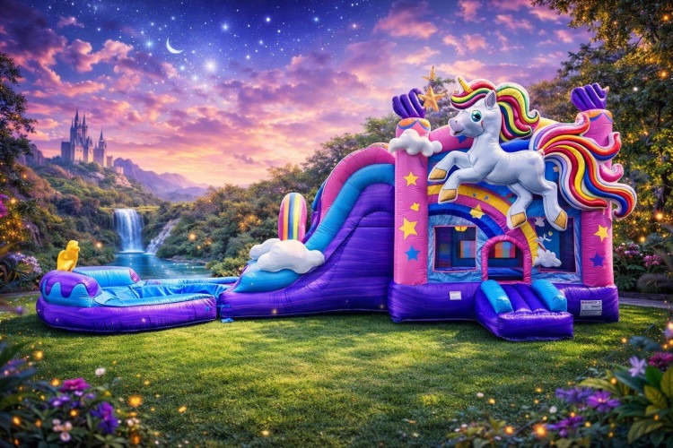 Unicorn Bounce House Combo — a dazzling, all-in-one inflatable that turns any backyard or event into a rainbow-filled playground. This combo features a roomy bounce area with safety netting, a climb-and-slide element that sends kids down a gentle, colorful slide, and an attached splash pool option for wet play. Bright purple and pink hues, cheerful clouds, stars and a large three-dimensional unicorn graphic make it perfect for birthday parties, school events, or family gatherings. Designed for active, supervised fun, it includes a low entry ramp for easy access and multiple viewing windows so adults can keep an eye on jumpers. Choose between wet or dry setup; optional accessories include a generator, long water hose, slide lubricant, mini basketball and gymnastic mat, or hourly event staff. Simple to use and built for smiles, this combo delivers safe, high-energy entertainment for young children without overwhelming your space.