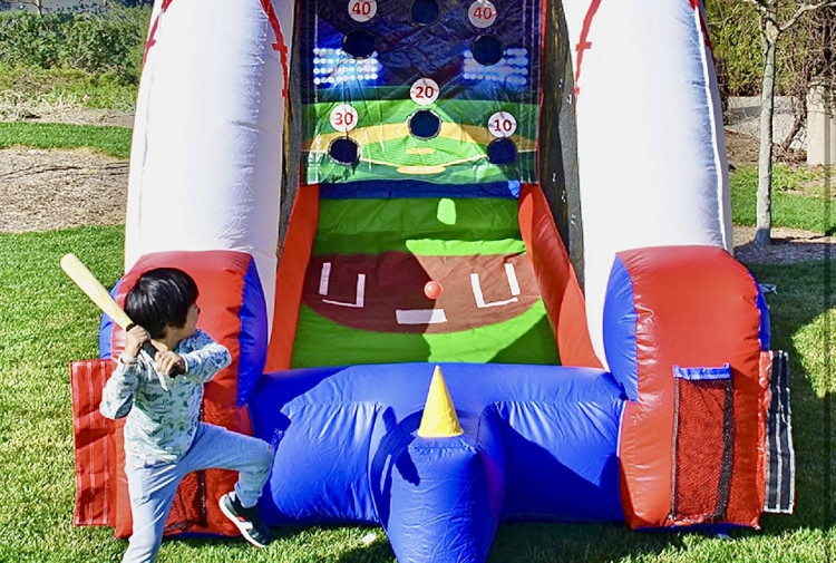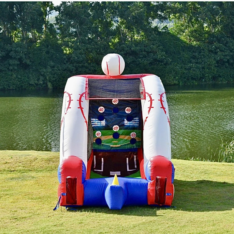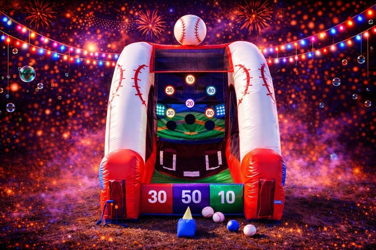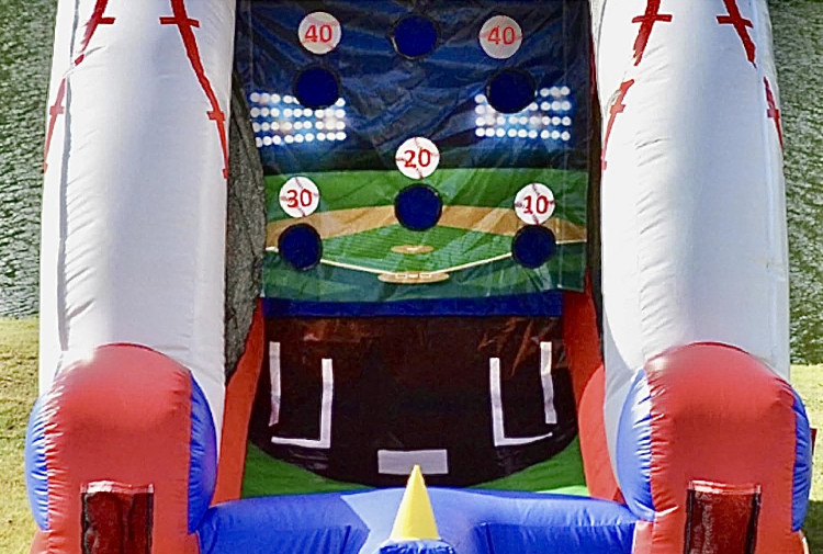 Step up to the plate with this inflatable Baseball Game — a compact, eye-catching carnival-style target toss that brings big-league fun to birthday parties, school events, company picnics, or neighborhood block parties. Dressed in bold red, white, and blue with a giant baseball topper and printed field backdrop, it invites players to pitch or bat balls through a series of numbered holes (10–60 points) for instant friendly competition. The angled play lane gently guides balls back toward the front, and high sidewalls and secure mesh panels keep the action contained and visible for spectators. Durable vinyl construction and clear scoring targets make it easy to run casual matches, relay challenges, or timed score contests for all ages. Rented with a 4500 W generator option and hourly event staff if you want on-site setup, power, or assistance, this Baseball Game is a compact, crowd-pleasing way to add sporty excitement and competitive fun to any outdoor or indoor gathering.
