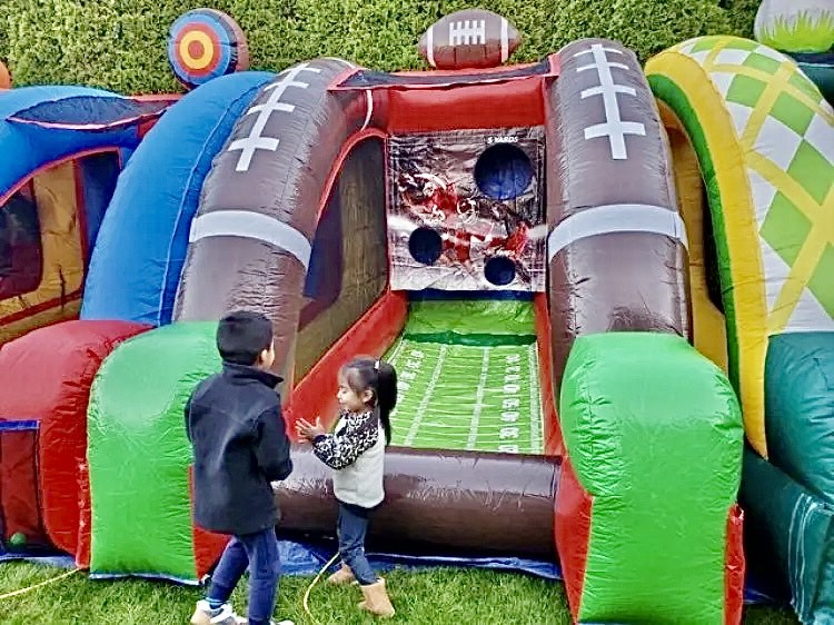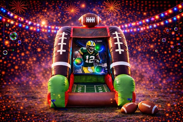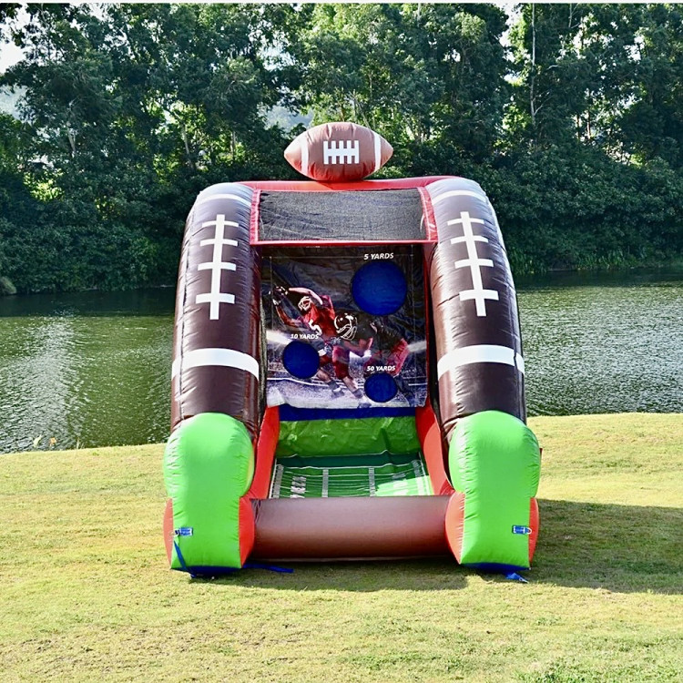 Tackle game-day fun with this Football Game inflatable — a goal-oriented carnival-style challenge that’s perfect for backyard parties, school events, and team fundraisers. Designed like an oversized football tunnel, it features a turf-style runway leading to a target wall with three circular cutouts for aiming throws or kicks. The arching brown sides are accented with white laces and topped by an inflatable football, so it reads instantly as a football-themed attraction that draws attention and encourages competition. Kids and adults alike can take turns trying to hit the 5-, 20- and 50-yard targets, keeping score or just enjoying casual play. Built for repeated, supervised use at events, it pairs well with a generator (4500 W) for continuous airflow and can be staffed by event personnel if you’d like assistance managing lines and enforcing safety. Bright, bold colors and clear target openings make it easy to see and play from a distance, and the low front bumper provides a simple step-in while helping contain balls. Ideal for sports-themed birthdays, tailgates, school carnivals, and community festivals — entertaining, straightforward, and instantly recognizable as football fun.
