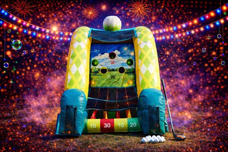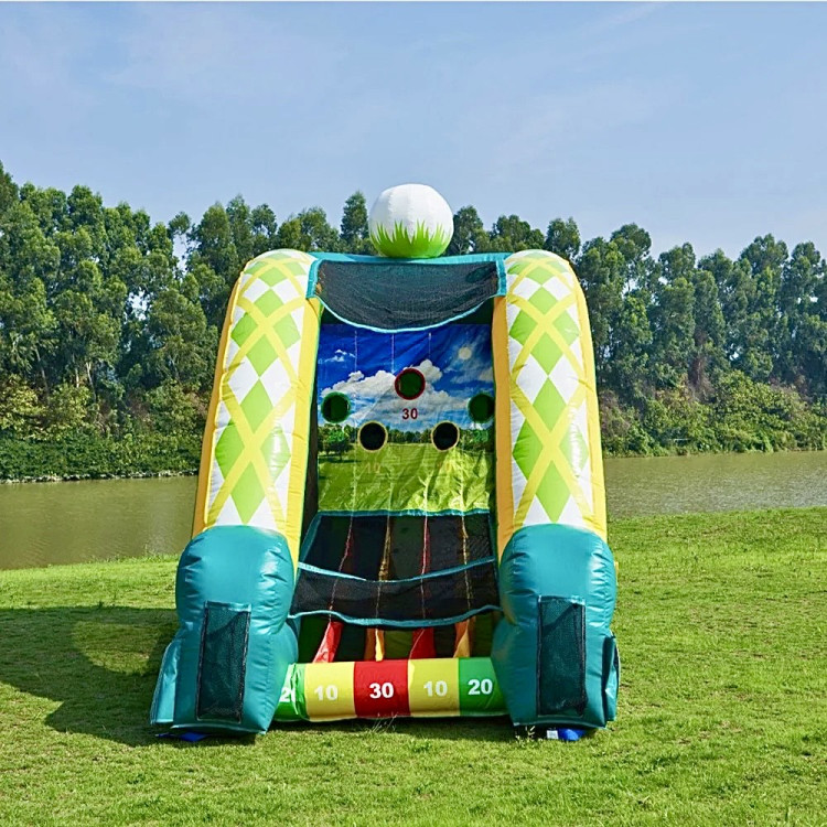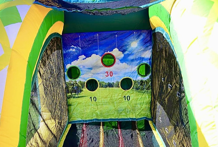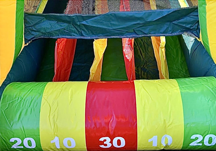 Bring a carnival-style Golf Target to your event — a compact, colorful inflatable game that’s perfect for backyard parties, school fairs, company picnics, and festival game lines. Players stand a short distance away and try to launch balls through five scoring holes (two 10-point pockets, two 20-point pockets, and a 30-point bullseye) while the soft, enclosed launch lane and padded front bumper catch missed shots and keep play tidy. Mesh side panels keep the action visible and safe, and the numbered pockets on the front make scorekeeping fast and simple. Bright, family-friendly graphics and a lightweight inflatable build give the unit instant party appeal and make setup and takedown straightforward for event staff. Available with a 4500 W generator and hourly event staff so the attraction can operate wherever you need a compact, easy-to-run game station that encourages friendly competition for all ages.