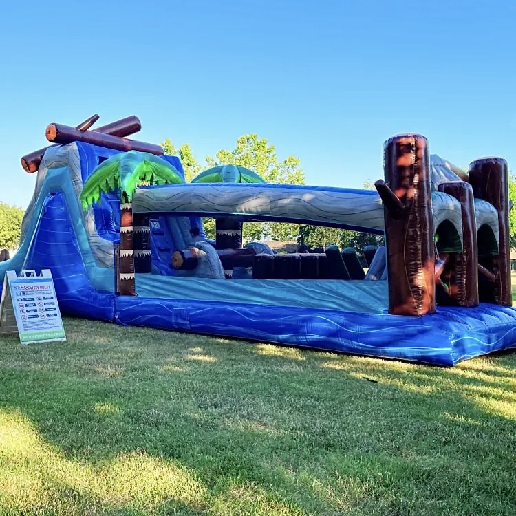 Tropical (45 Ft) Obstacle Course — A sun-drenched, thrill-packed challenge course built for big backyard parties and community events. This 45-foot inflatable blends a tall double-lane climbing wall and twin slides with a long obstacle run, featuring palm-tree accents and log-style elements that create a fun tropical theme. Players climb the padded ladder, race down the side-by-side slides into the splash pool (wet or dry option available), then push through the obstacle section with inflatable pillars, logs, and crawl passages that test speed and agility. Constructed for repeated rental use, it offers high sidewalls and mesh panels for visibility and airflow, cushioned landings, and a roomy course that accommodates kids and teens racing head-to-head. Add-ons include a 150 ft water hose and Slide Slick for wet setups, a 4,500 W generator if power is needed, optional gymnastic mat for extra landing protection, and hourly event staff for supervision. Vibrant, easy to spot and designed to keep a crowd entertained, this obstacle course delivers excitement, friendly competition, and picture-ready moments without asking for complicated setup from hosts.