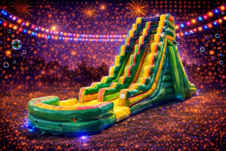 Towering at 19 feet, the Amazon Waterslide brings high-adrenaline fun and a splash-ready finish to backyard parties, school events, and community gatherings. Built with bright, jungle-inspired greens and yellows and a wide dual-lane chute, this slide lets two riders race side-by-side down a steep, safely contained track into a cushioned splash pool. Durable vinyl construction, high side walls, and a textured climbing lane with handholds keep riders secure from the base to the peak, while the deep pool at the bottom softens the landing and collects water for a true wet-slide experience (can be set up dry if preferred). Compact enough to suit most yards yet big enough to wow guests, the Amazon (19 Ft) pairs well with a 4500 W generator and includes optional accessories like a 150 ft water hose, slide slick lubricant, or on-site event staff to make setup and operation effortless. Ideal for teens and adults looking for a thrilling, reliable attraction that stands out visually and performs safely all day.
