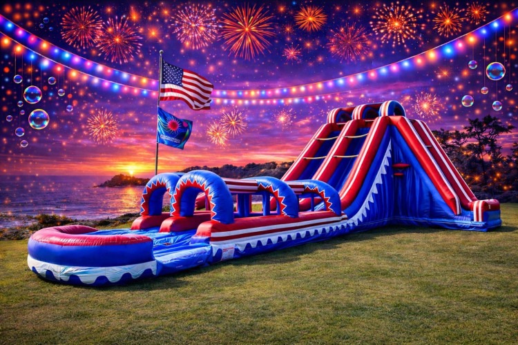 Flash (20 Ft) Dual Lane Waterslide With Slip N' Slide — a bold, high-energy centerpiece for backyard parties, block events, or summer fundraisers. This all-in-one inflatable combines a tall 20-foot dual-lane slide with an extended slip-and-slide run and a shallow catch pool, letting guests race side-by-side, zoom through arched splash tunnels, and finish with a wet landing that keeps the excitement going. Vivid red, white and blue graphics and scalloped wave accents make it a standout photo backdrop while heavy-duty vinyl and reinforced seams deliver reliable performance for repeated use. The climbing wall between the lanes features foam step grips for confident ascents, and the wide lanes and low-profile pool give riders a satisfying, splashy finish. Available wet or dry; optional add-ons include a long water hose, a 4500 W generator, slide slick for faster rides, and event staff for hourly supervision. Ideal for groups who want high-capacity thrills and head-to-head racing in a single rental.