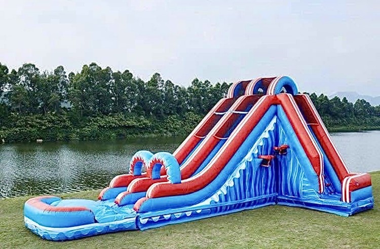 Get ready for a tidal wave of fun with the Flash (20 ft) Dual Lane Waterslide. This rental offers twice the excitement with side-by-side lanes, perfect for racing your friends to the splash zone. Whether it's a birthday bash or just a hot summer day, this towering waterslide guarantees thrilling slides and refreshing landings. Standing 20 feet tall, it's an adventure that will leave everyone soaked in laughter and joy, creating unforgettable memories.