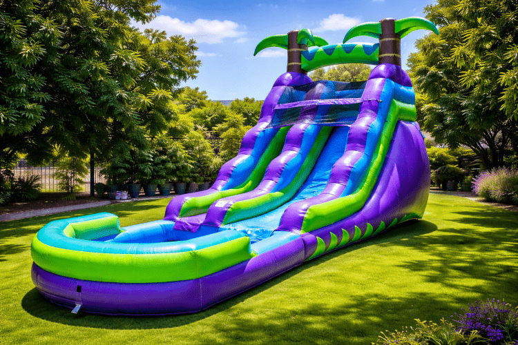 Brings a bright, fun island look to any event with its bold purple color and tropical-inspired style. At 16 feet tall, it offers an exciting slide experience that stands out as a centerpiece for birthdays, summer parties, school events, neighborhood gatherings, and other celebrations. Its lively design adds a festive feel while giving guests a cool way to enjoy the day. This rental is a great choice when you want a slide that feels playful, eye-catching, and perfect for warm-weather fun.